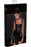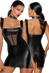 Crafted from luxurious powerwetlook, this dress exudes a sleek and modern allure. The standout feature is the striking contrast between the glossy wetlook fabric and the delicate tulle inserts that adorn the front. The dress boasts a flattering silhouette, with a fitted bodice and a playful mini length. The velvet straps with decorative frill add a touch of opulence and complete the seductive ensemble.