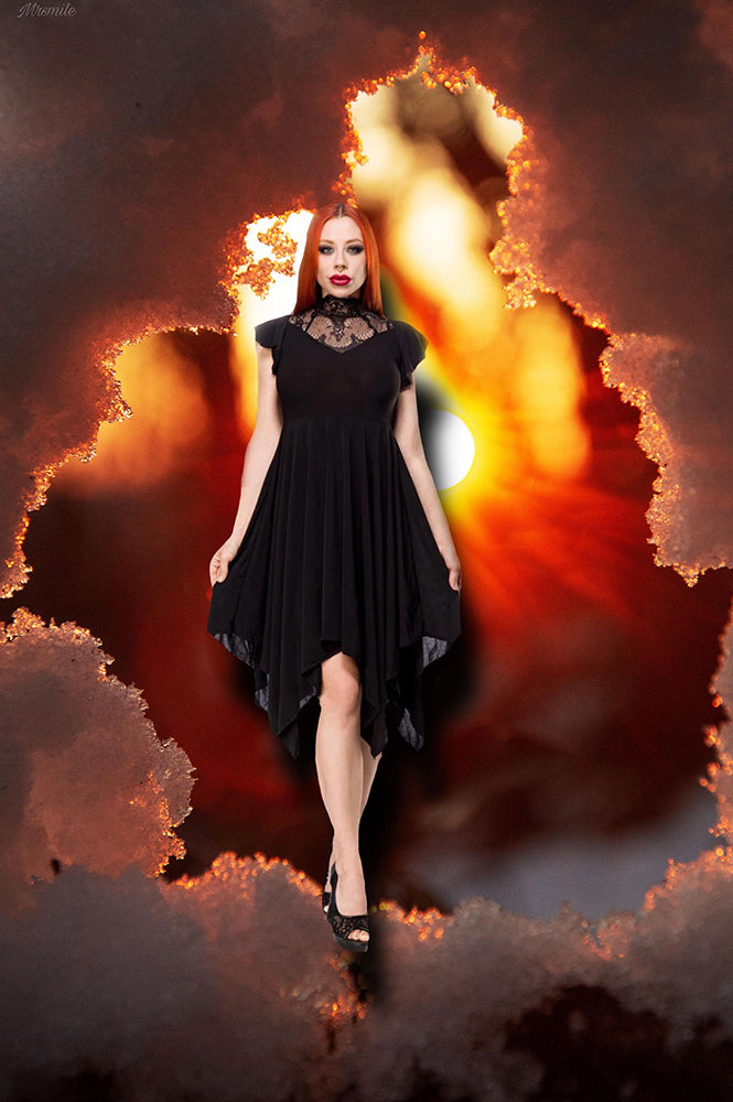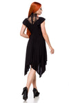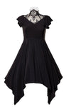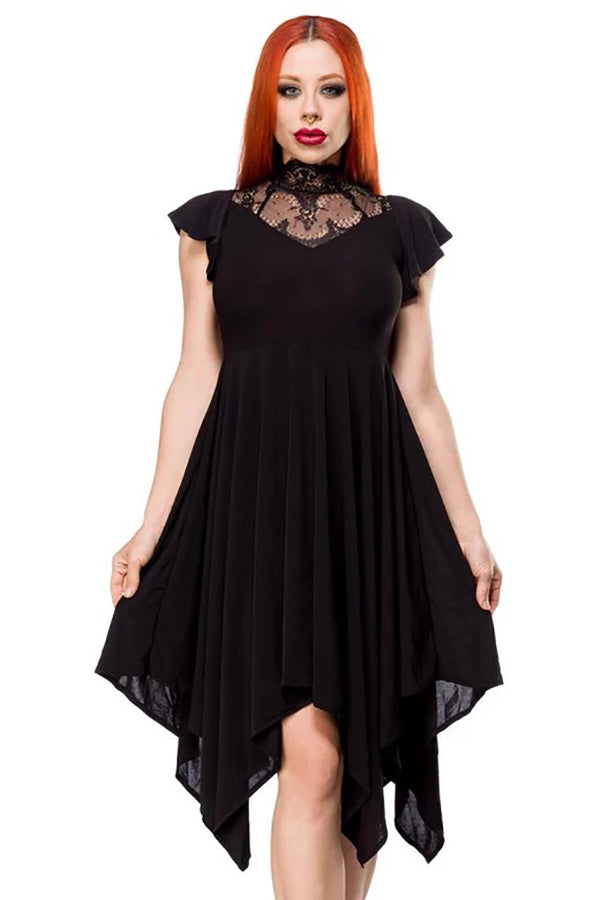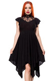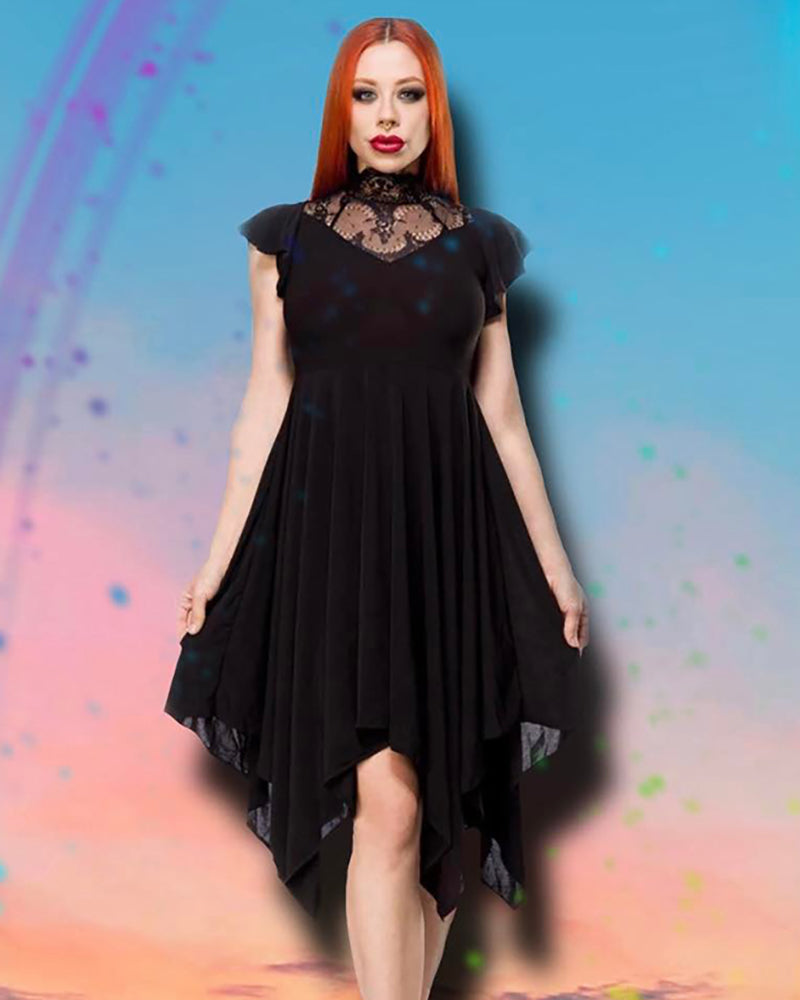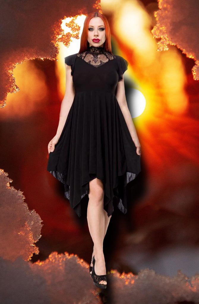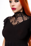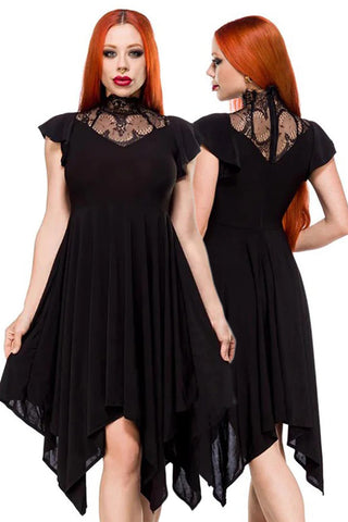Indulge in the allure of the Ocultica Lace Insert Dress, a masterpiece of gothic femininity. This captivating dress features a high neckline, cap sleeves, and a flared skirt, creating a silhouette that exudes both elegance and edginess. The centerpiece of this stunning design is the transparent lace insert, adding a touch of mystery and sophistication.