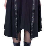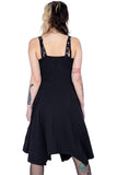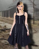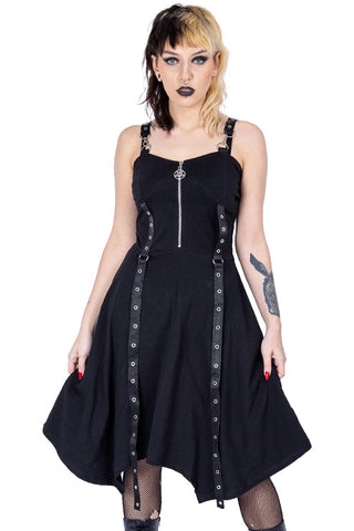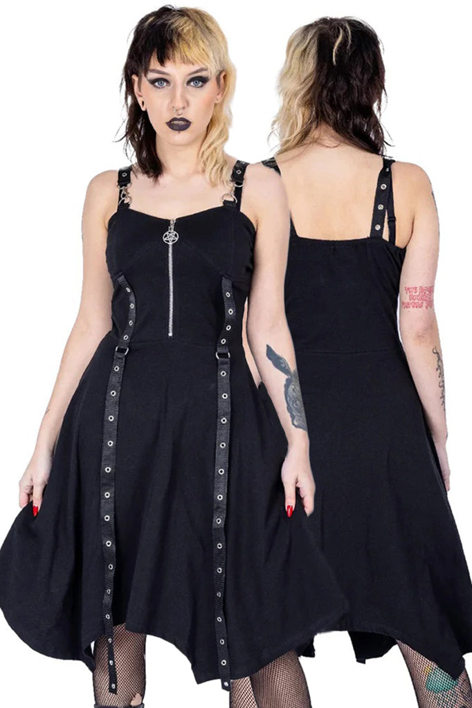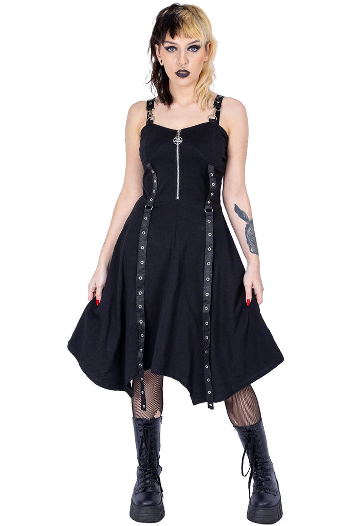 Black Cotton mid-length summery dress with black webbing and eyelet detailed shoulder straps with clip fastening, The dress also features matching webbing straps down each side at the front of the dress. There is a central partial zip closure to the waist with pentagram zipper pull. The hemline is shaped with an upward dip in the centre.