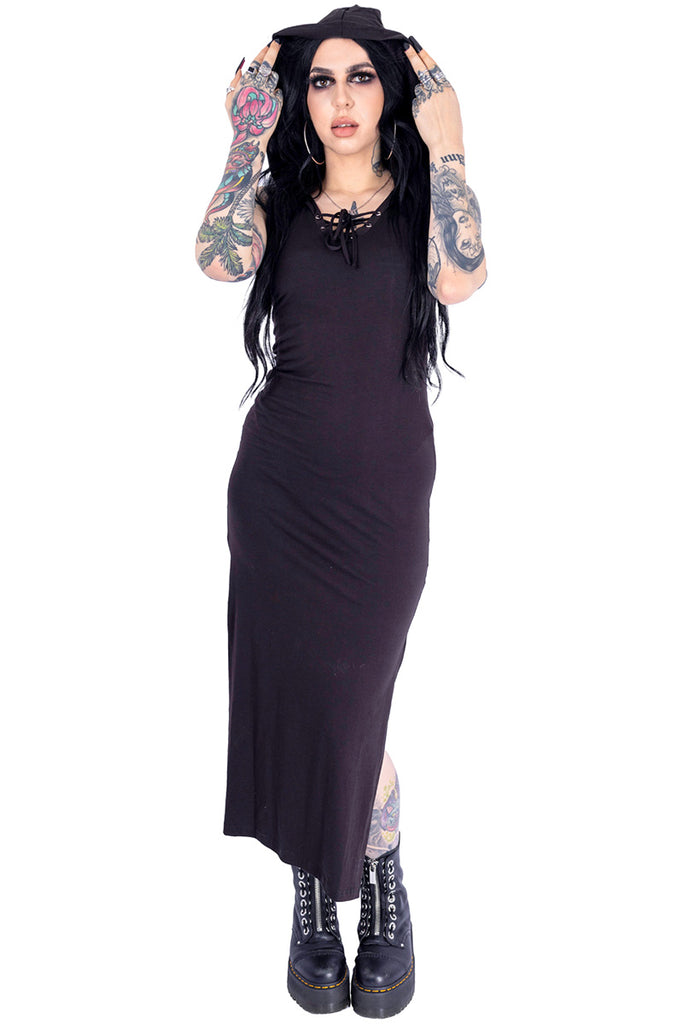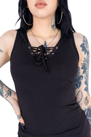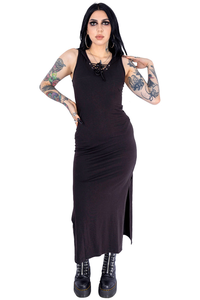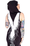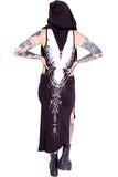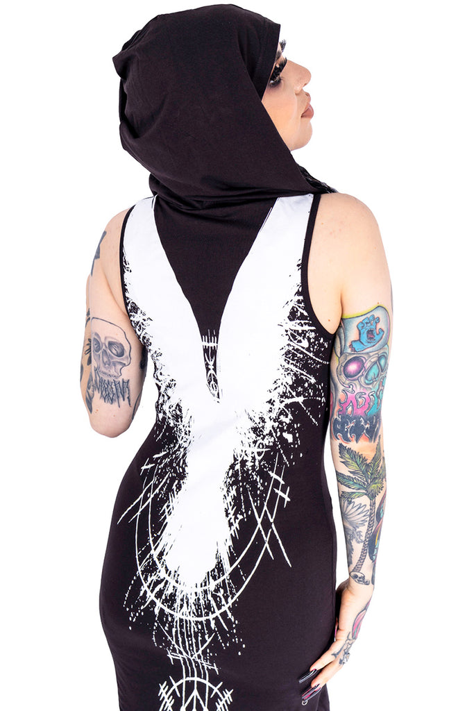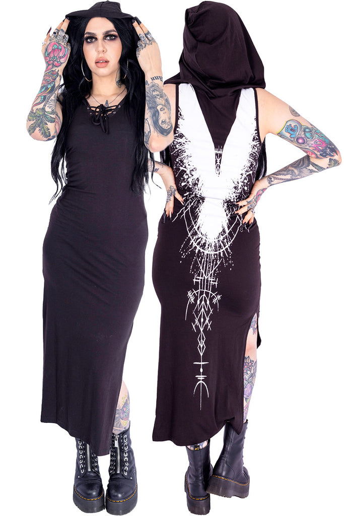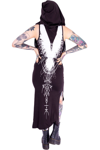 This black hooded Maxi Dress features a white print on the back with stylized raven design with open wings which give the impression of wings on your back. Below this are geometrical symbol designs. The long dress has side slits and features a lace up tie through eyelets at the neck. The hood can be worn up or down.