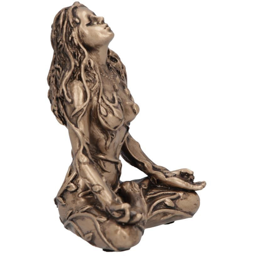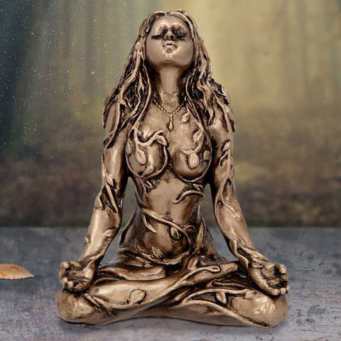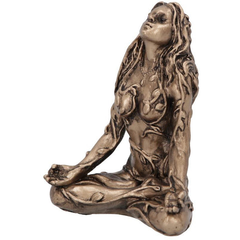 Gaia, meaning Greek Goddess of Earth and mother of all life. Also depicted with the personification of the seasons, which indicates her position as a fertility and agriculture goddess. Here she sits crossed legged, palms facing upwards resting on her knees, and she has long vines flowing over her body. Cast in the finest resin before being finished in bronze, this Gaia figurine is perfect for spiritual lover.