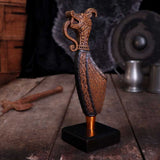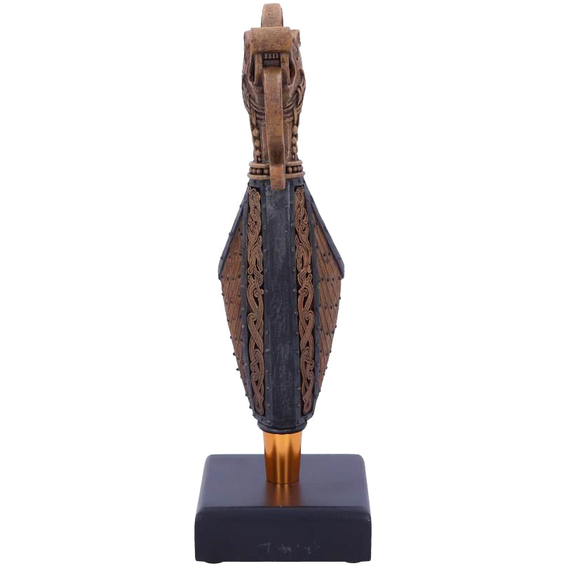 Stood on a black stang, a bow of a boat can be seen. Featuring a dragon's head, which can be seen sticking its tongue ours towards any onlookers. With a wooden effect and Celtic patterning, this rustic ship ornament is a show-stopping product that will leave your customers wanting more. Cast in the finest resin before being expertly hand-painted, this product is the perfect addition to any medieval collection.