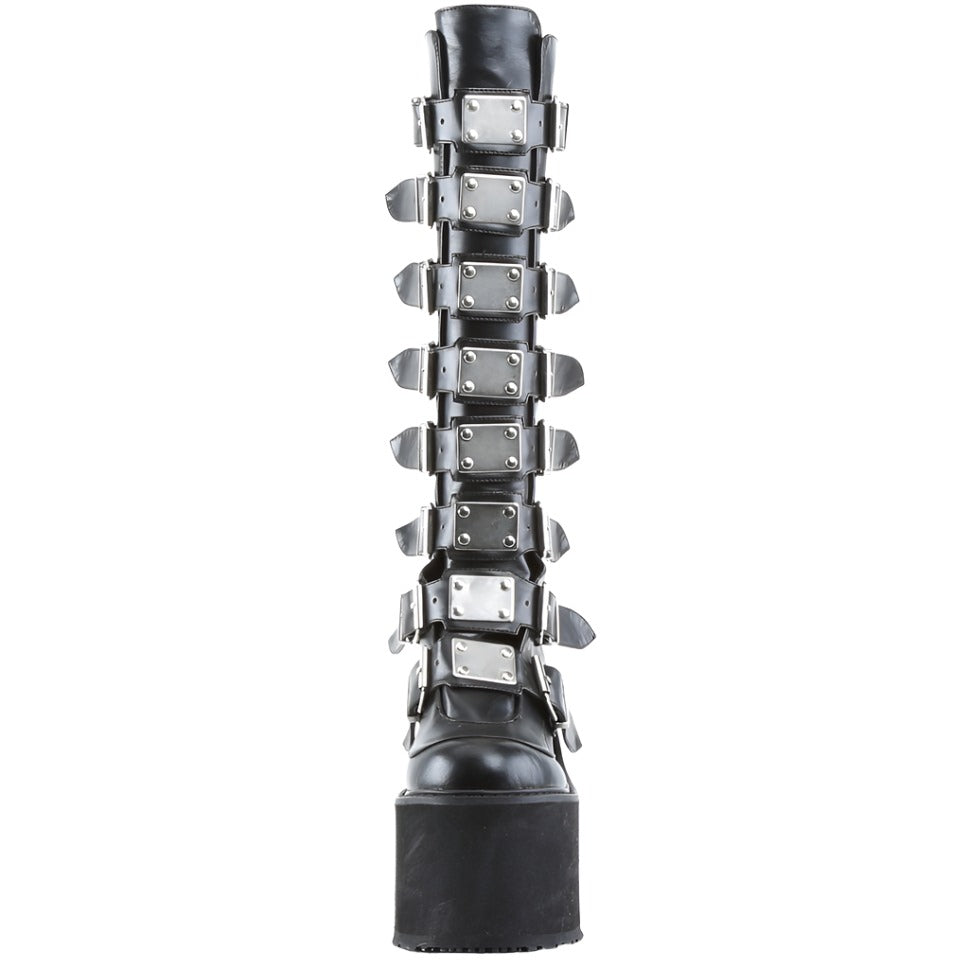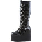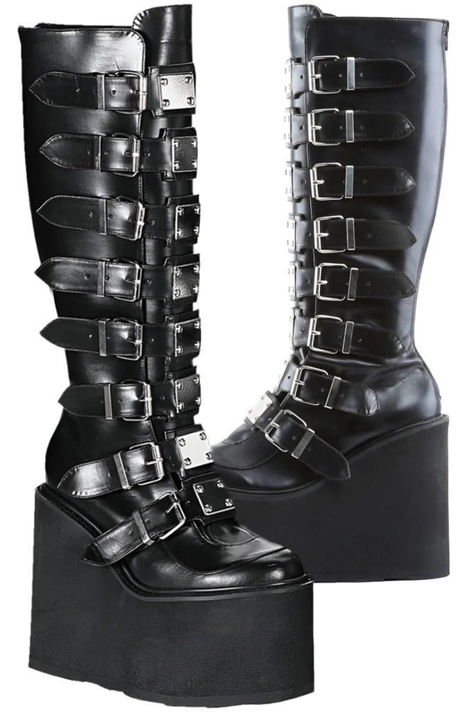 Swing 815 Black Leatherlook Matte PU knee boots with eight double buckle straps with riveted metal front plates, three inch platform sole with five and a half inch platform heel and back zip fastening.