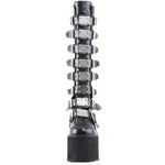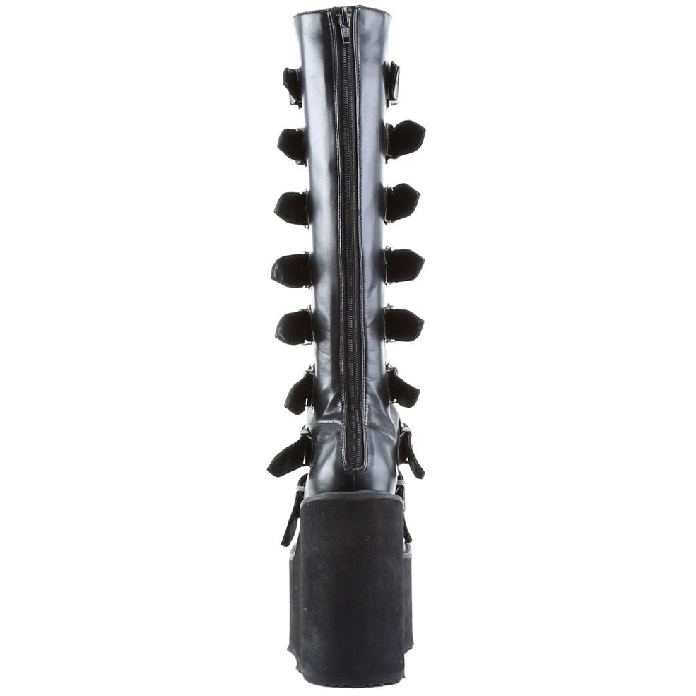 Channel your inner rock goddess with the DemoniaCult Swing 815, knee-high boots that ooze attitude and style. Crafted from a matte PU that mimics black leather, these statement boots boast a fierce combination of height and comfort. The 3-inch platform sole elevates your look, while the towering 5.5-inch platform heel adds serious drama. Eight double buckle straps adorned with riveted metal plates climb the front of the boot, creating a striking, rebellious look. A full back zip closure ensures effortless on-and-off wear.