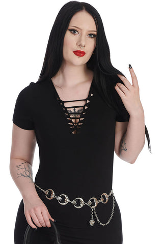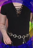 Unleash your inner moon goddess with the Banned Crescent Moon Belt! This eye-catching accessory is perfect for adding a touch of gothic glam to any outfit.