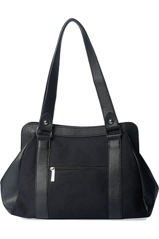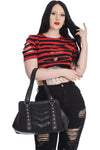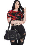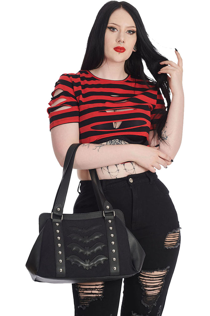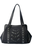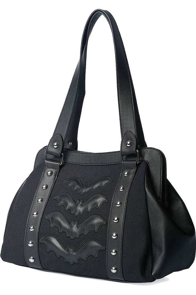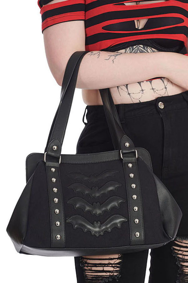 Black handbag from Banned. Decorated with a panel of four bats, additional stud details highlight the central panel.