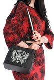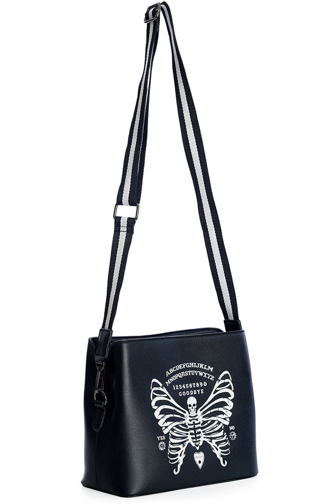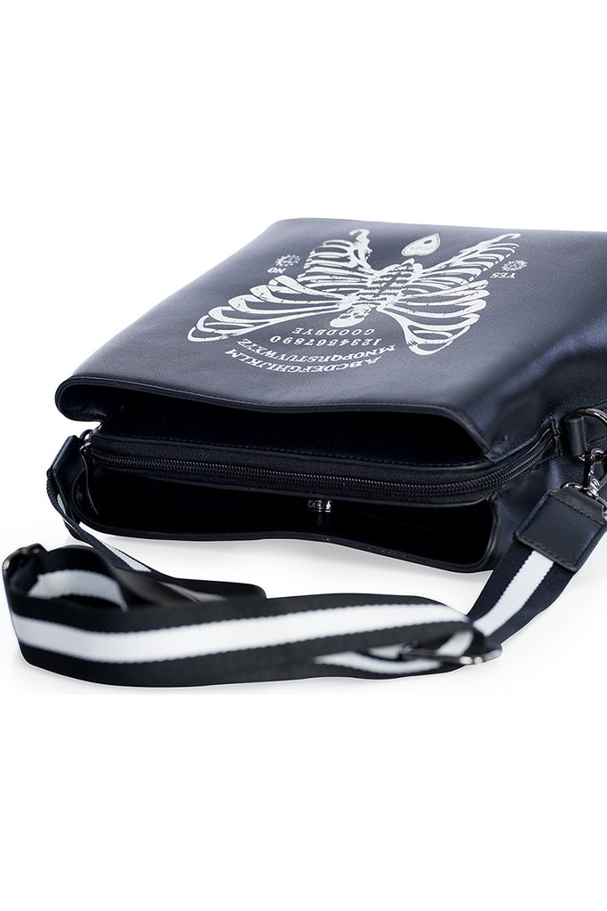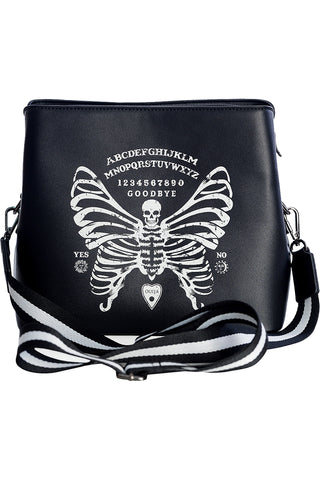 Black Banned shoulder bag with a skeleton butterfly in the center of a spirit board.