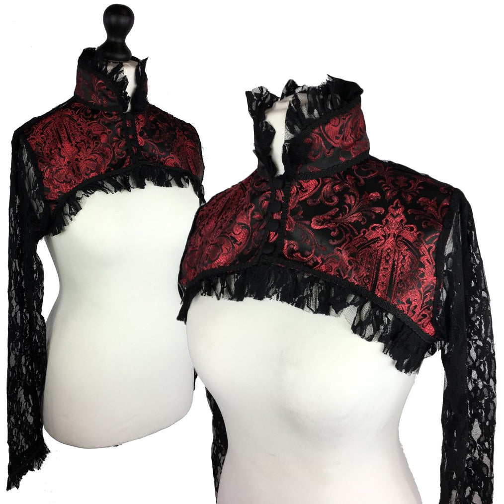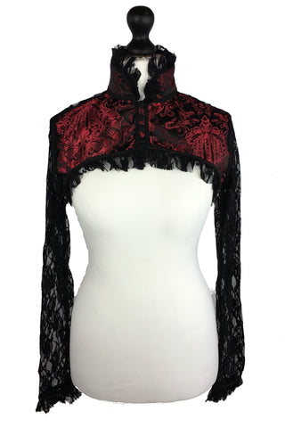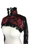 Burleska Raven Gothic Bolero shrug in Red King Brocade with Black Black Lace Back and Sleeves.