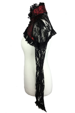 This stunning bolero shrug has a Red King Brocade front panel with black covered buttons and features a high collar with black lace trim and black braid edging. The back panel and sleeves are made from black lace.