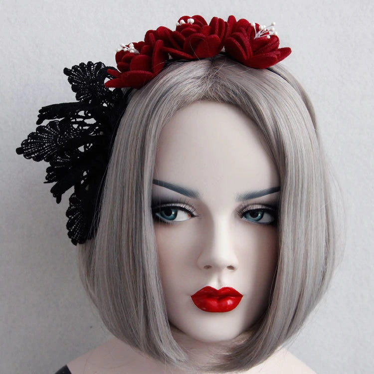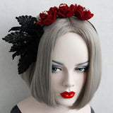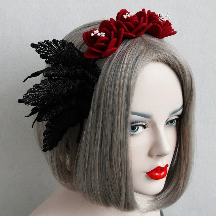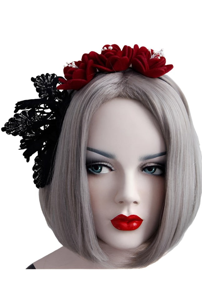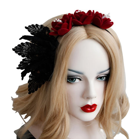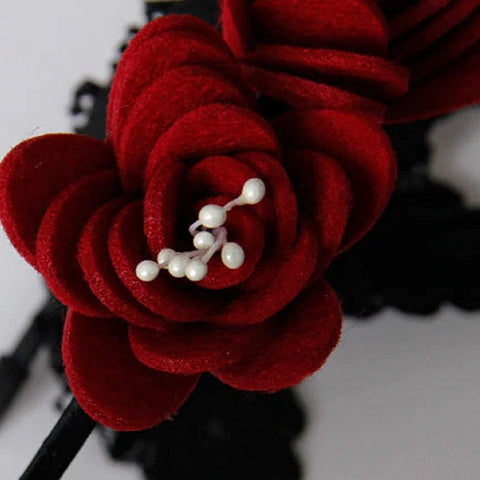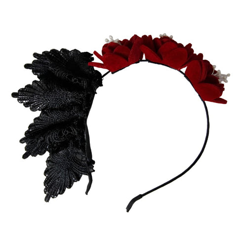 This eyecatching gothic flower hairband features three red felt roses with white pearl effect stamens in the centre and a concertina of black guipre style lace to one side.