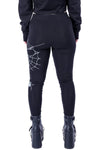 Crafted from a premium blend of cotton and elastane, these leggings offer exceptional comfort and flexibility. The standout feature is the dramatic slash detailing on the right and lower left leg, adding a touch of rebellious edge. The white spiderweb and dangling spider print on the front and side of the left leg create a striking and mysterious aesthetic.
