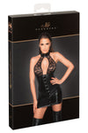 Exciting style for erotic moments! Dress with a tightly tailored cut in a black elegant mix of soft lace (top) and powerwetlook (skirt part). At the front with continuous press studs from the cleavage to the hem. Backless - the halter neck is closed with buttons.