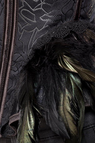 Adorned with captivating feathers and a delicate floral ornamental pattern, this corset exudes an air of opulence and glamour. The eyelet fastener in the front and lacing in the back offer a customizable fit, while the incorporated forming sticks provide essential support and shape. The adjustable straps ensure a perfect fit for every body type.