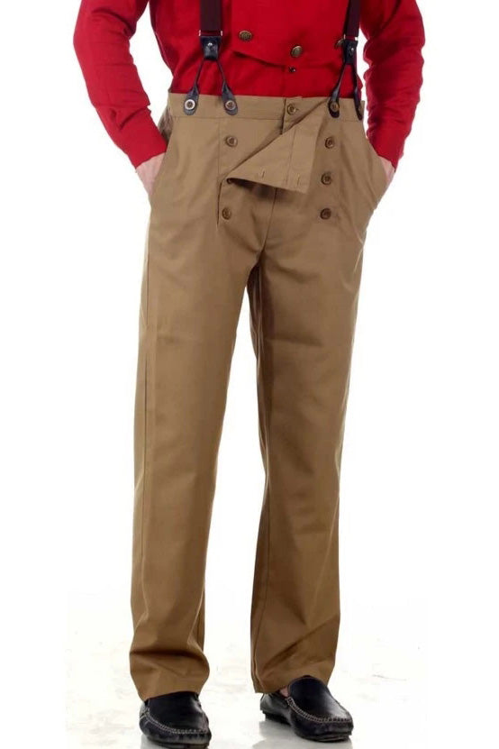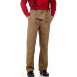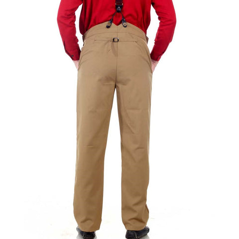These high-waist Victorian cut trousers in tussar fabric (polyester/ viscose ) are period perfect. These trousers have a regular fly which is covered with a front flap. The trousers are provided with buttons for wearing suspenders. (Not Provided) There is a back buckle with strap for size adjustment.