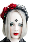 The lace and roses are mounted on a black metal headband with fabric caps to protect the ends and provide extra comfort.