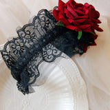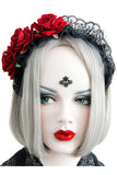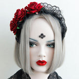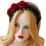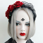 Gothic Lolita style hairband with ruffled black lace and three beautiful dark red flocked roses to one side.