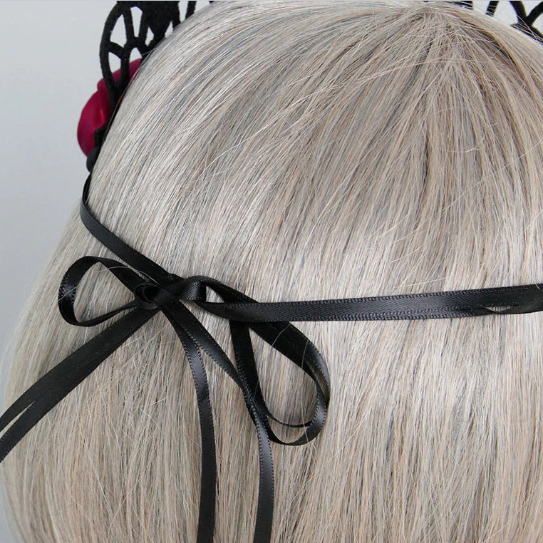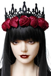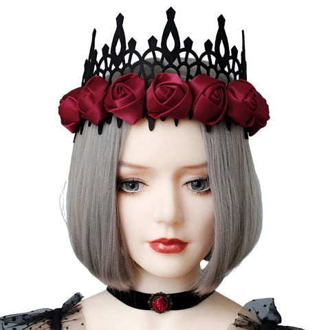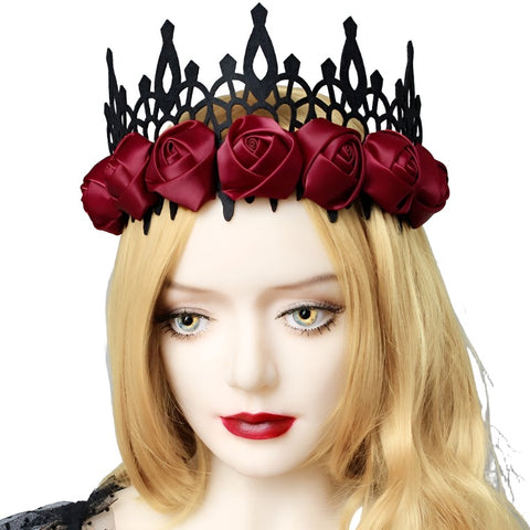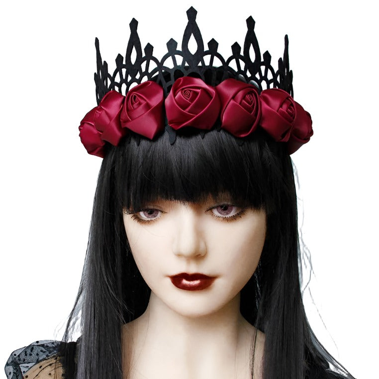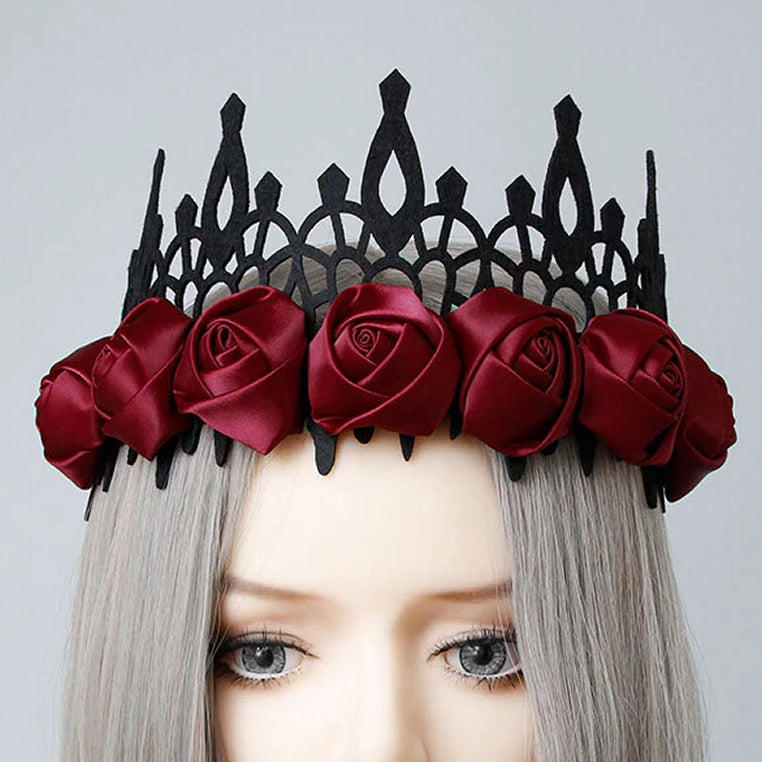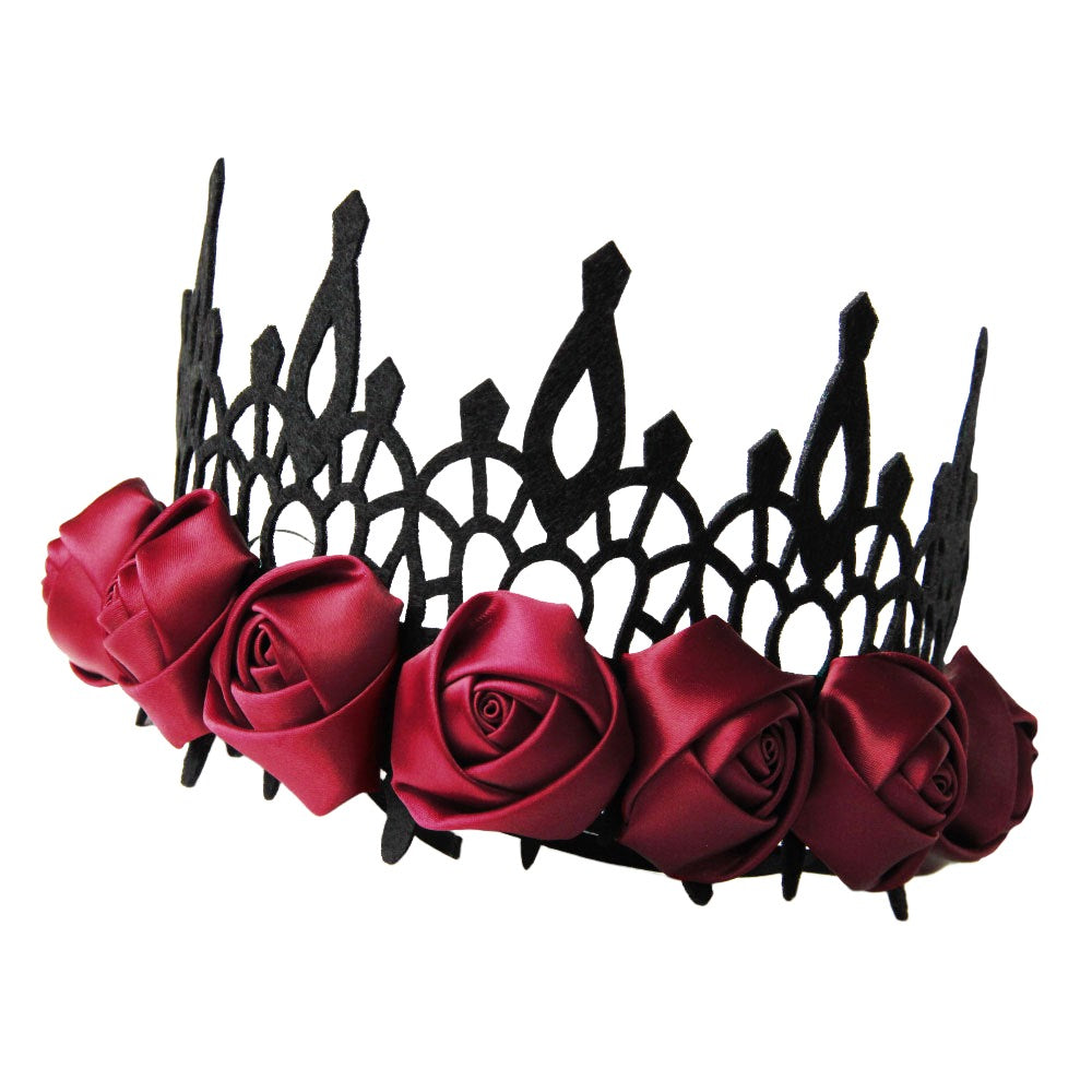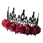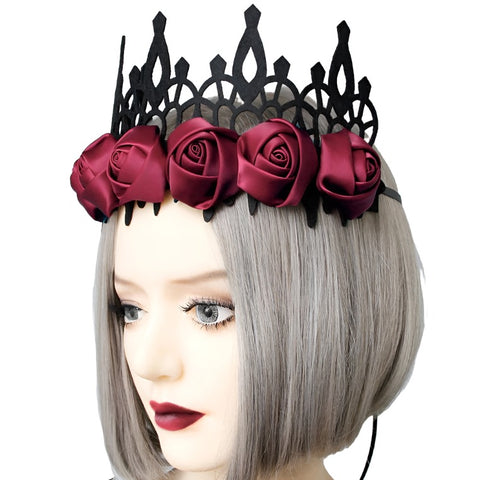 This stunning gothic crown features a row of dark red satin roses, mounted on lasercut black felt with a an ornate design.
