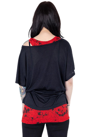 The oversized black outer layer exudes a mysterious allure with its off-shoulder design, while the vibrant red underlayer, adorned with a striking skull heart pattern, adds a touch of edgy flair. The racer-back style not only enhances your silhouette but also provides a glimpse of skin for a daring touch.