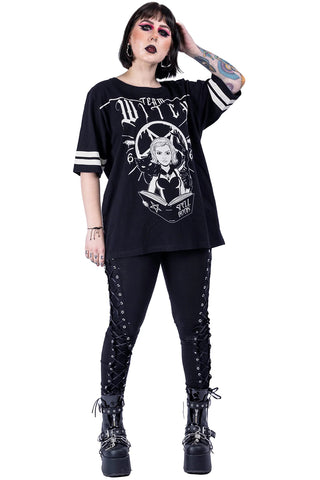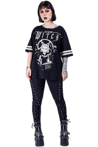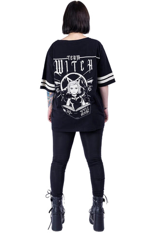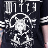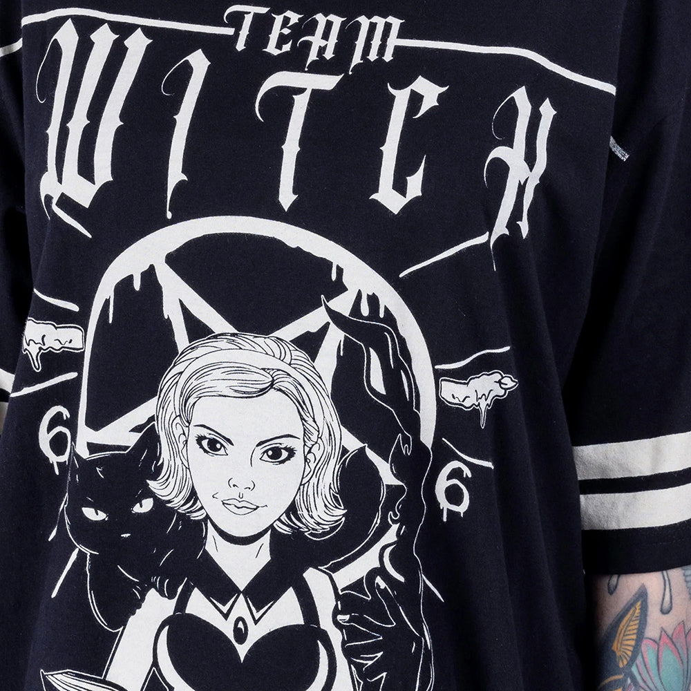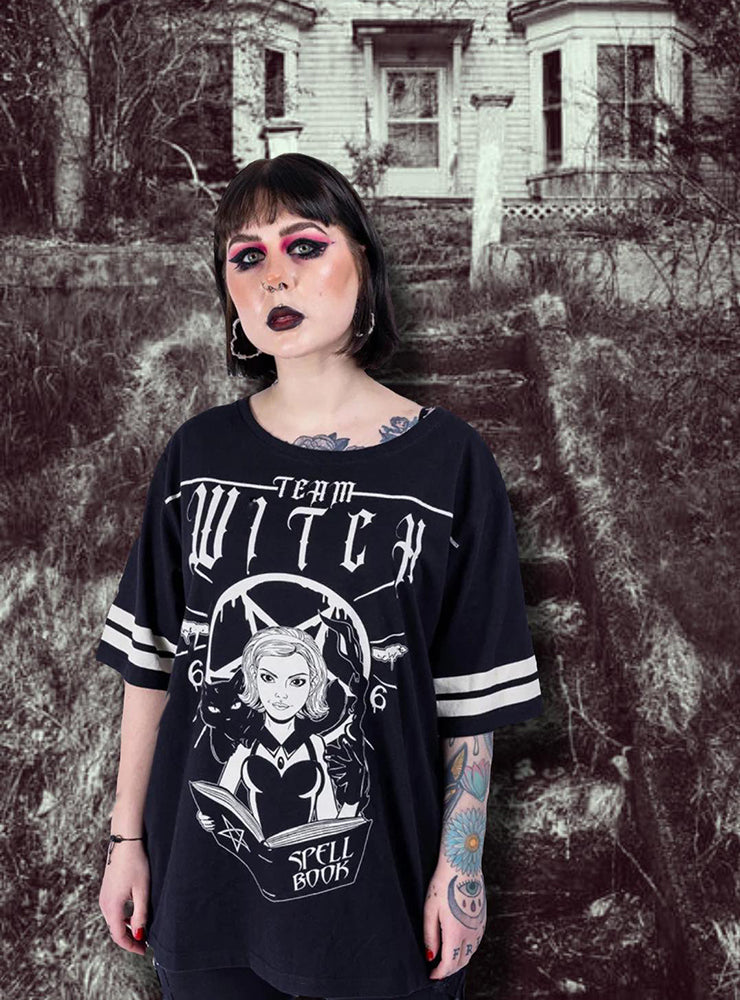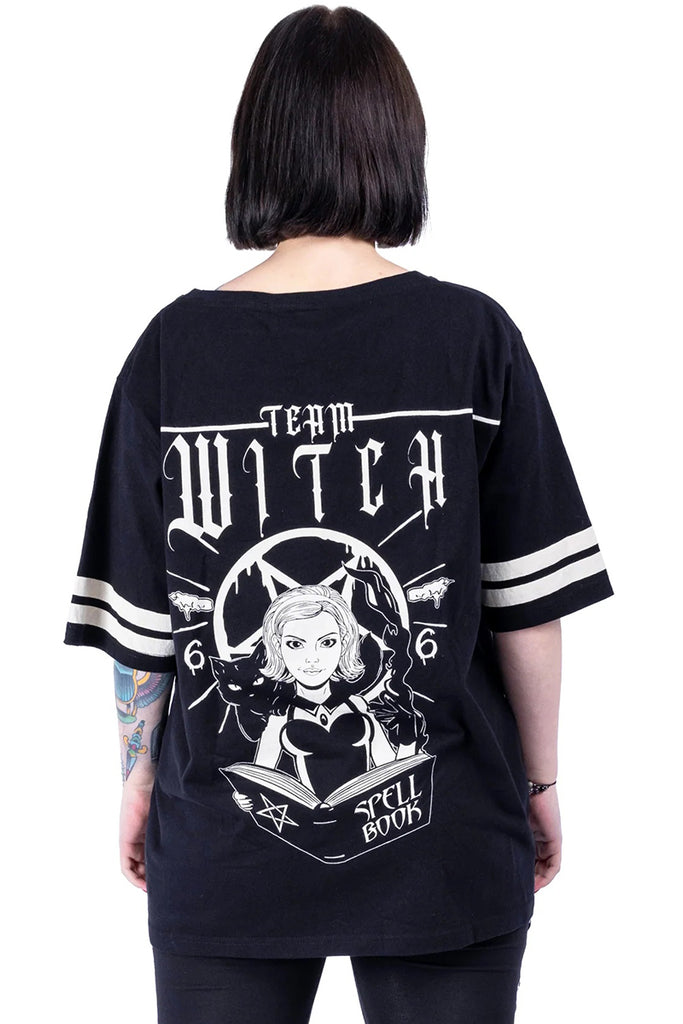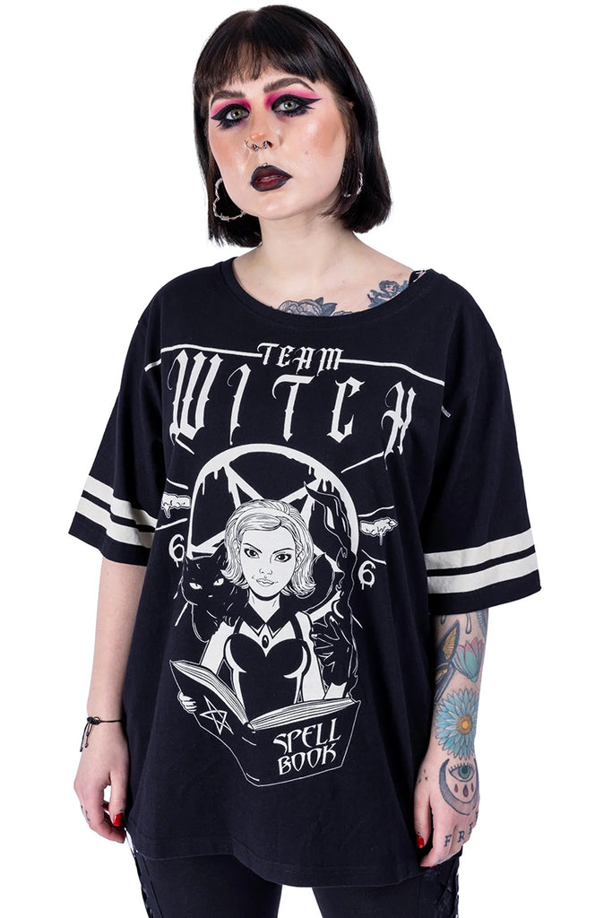 Cast a spell of style with the Heartless Team Witch Top, a must-have for any witchy wardrobe. This oversized black t-shirt exudes a gothic charm with its bold "Team Witch" design, featuring a varsity-style stripe detailing on the sleeves. Show off your witchy pride on both the front and back of this effortlessly cool top.