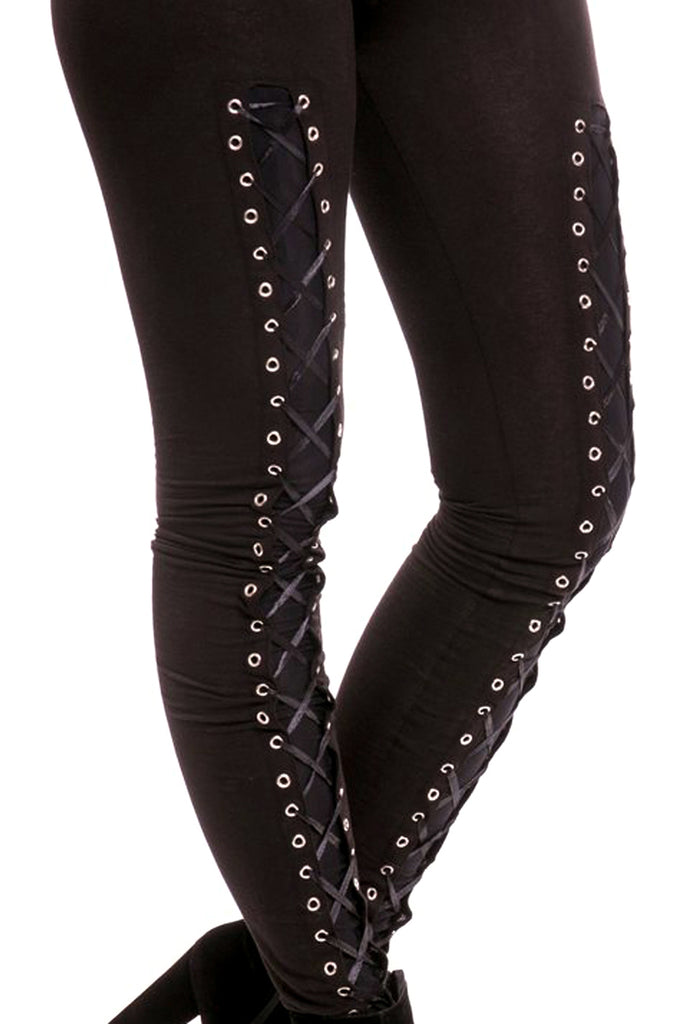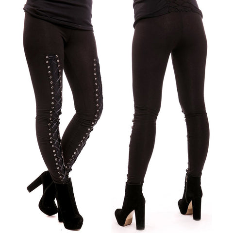 These aren't just leggings; they're a statement piece that effortlessly blends edgy style with feminine grace. Crafted from a luxurious blend of 95% cotton and 5% elastane, these tight-fitting leggings offer unparalleled comfort and durability. The standout feature is the captivating lace-up front panel, adding a touch of gothic glamour to your outfit.