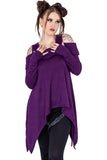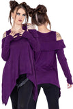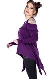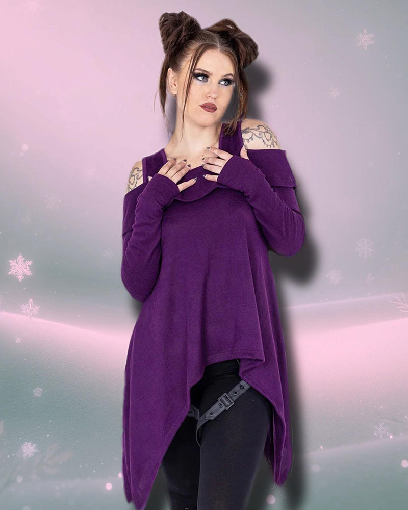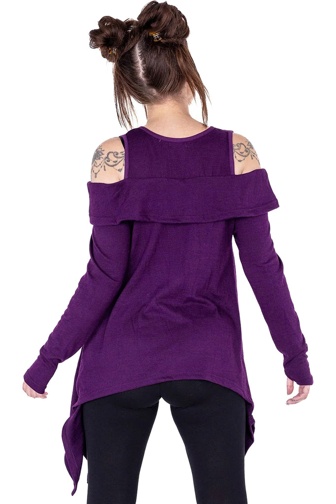 Ladies long sleeve cold shoulder purple top with hanky hem - longer at the sides and shorter in the centre. The sleeves have thumbholes.
