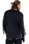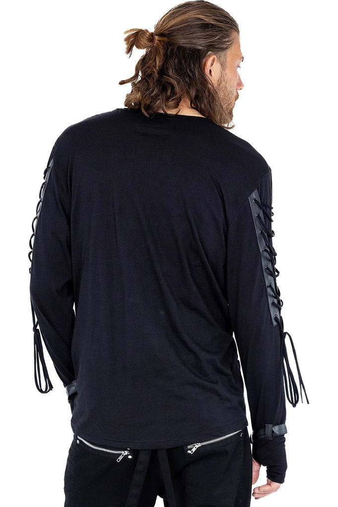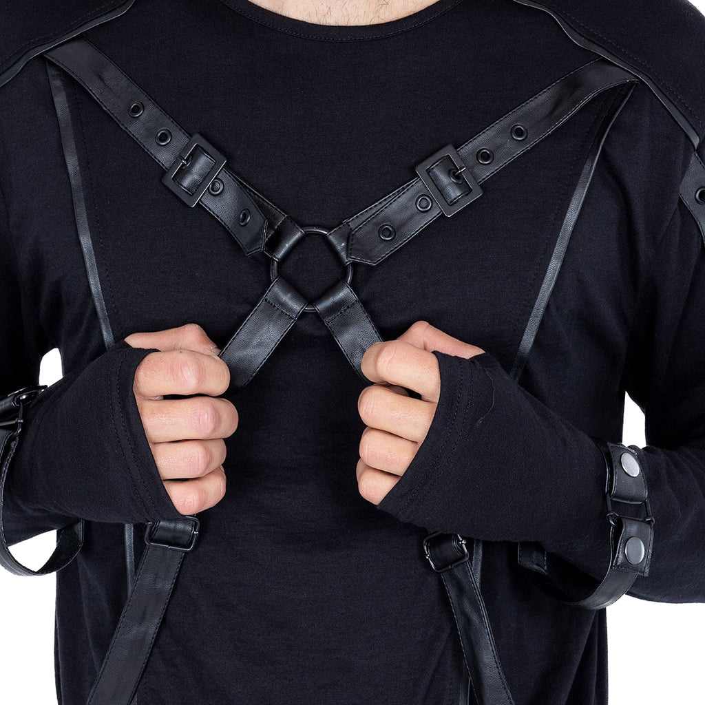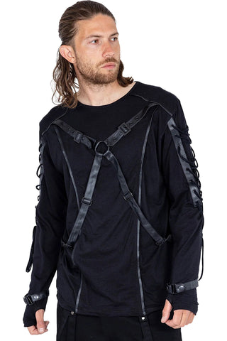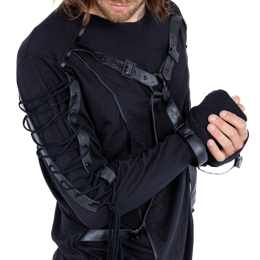 Mens Longsleeve Gothic Alternative Top with faux leather trim, harness strap detailing across the front and straps at the wrists. The top has corset style lacing down the outside of the sleeves.