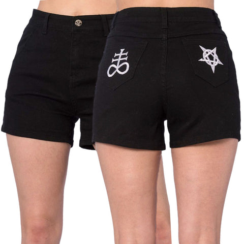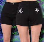 Banned Ladies Black Denim Hot Pants with Pentagram and Mystic Symbols