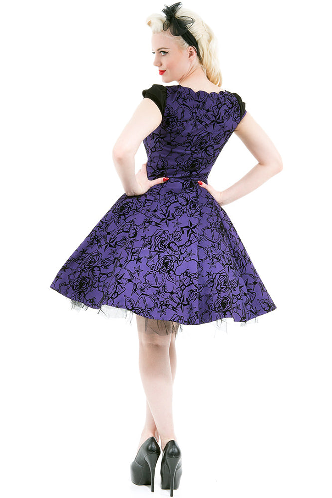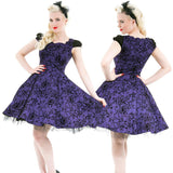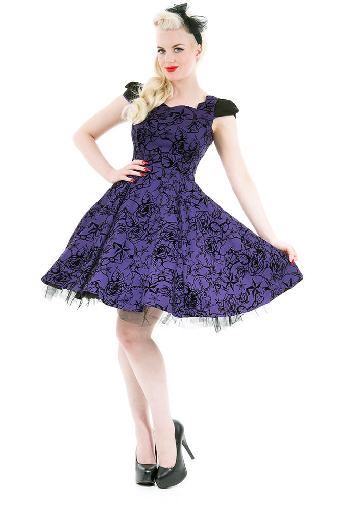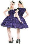 Ladies Flocked Purple Evening Swing Dress from Hearts and Roses London.