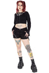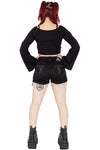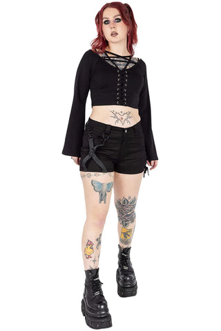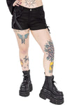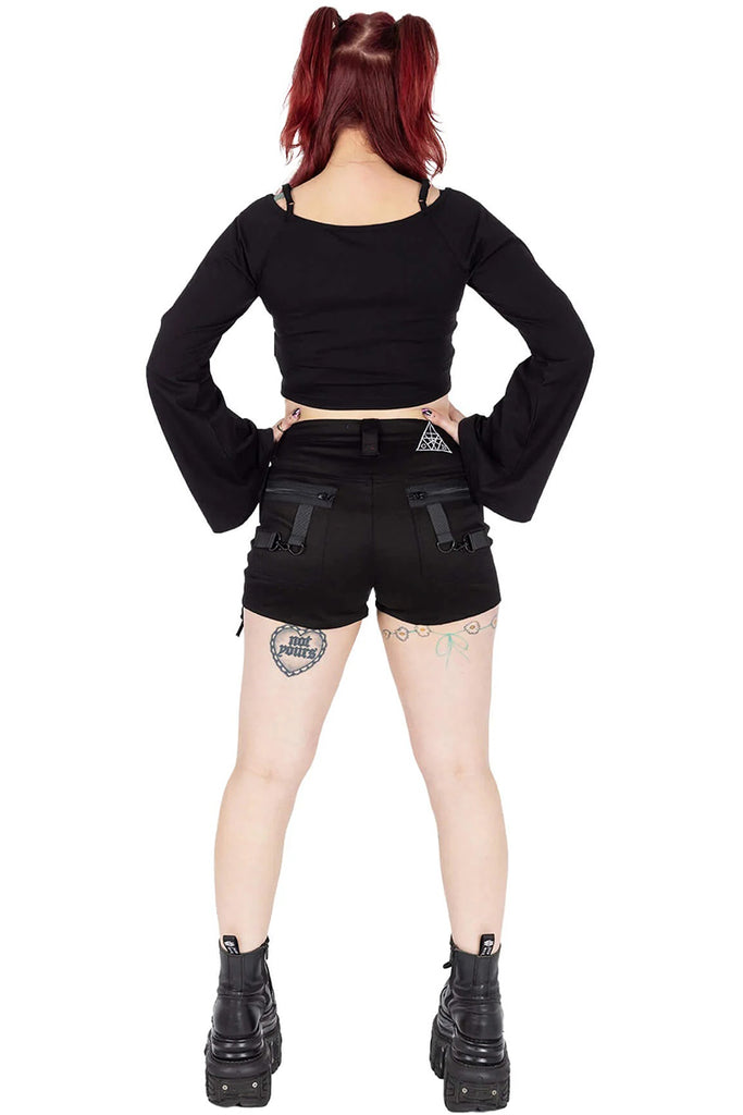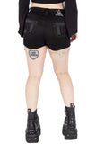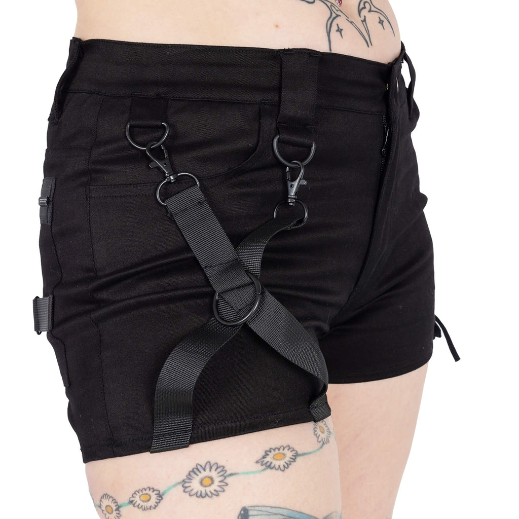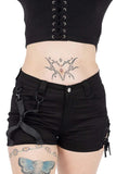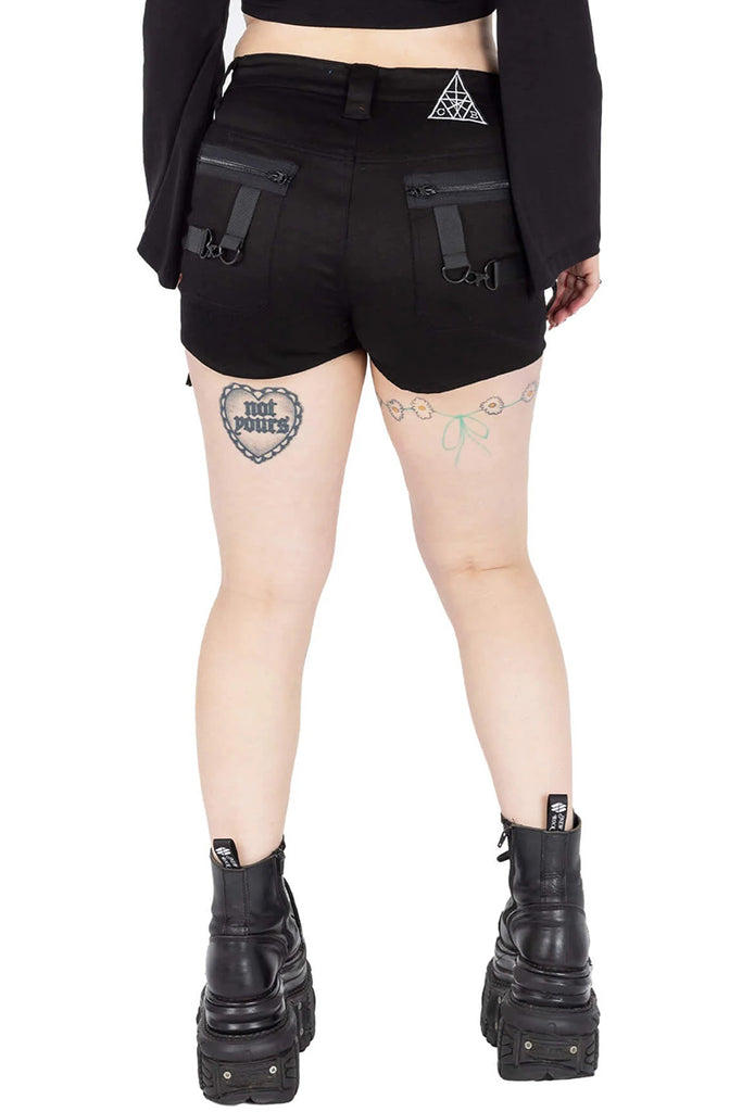Ladies cute gothic shorts with webbing straps and clips detailing on the right side and on the pockets at the back. The left leg has a lace up slit detail. The shorts fasten with a zip and button at the front. There is a black and white triangular mystical symbol patch on the waistband on the back of the shorts.