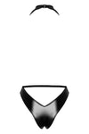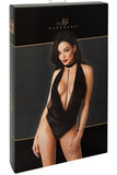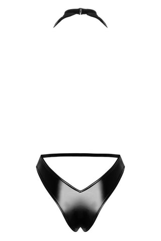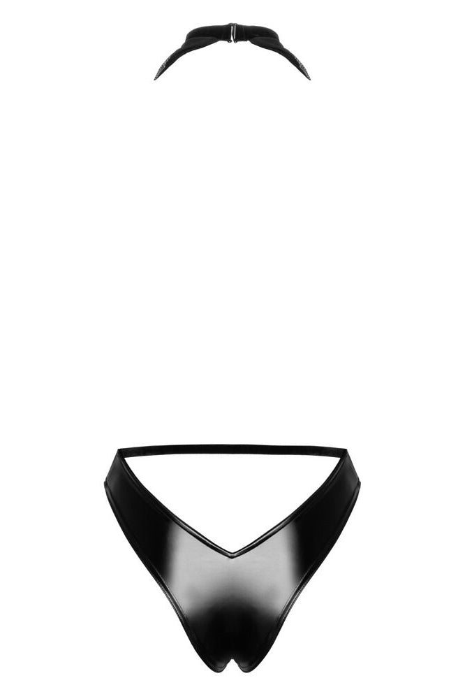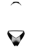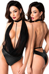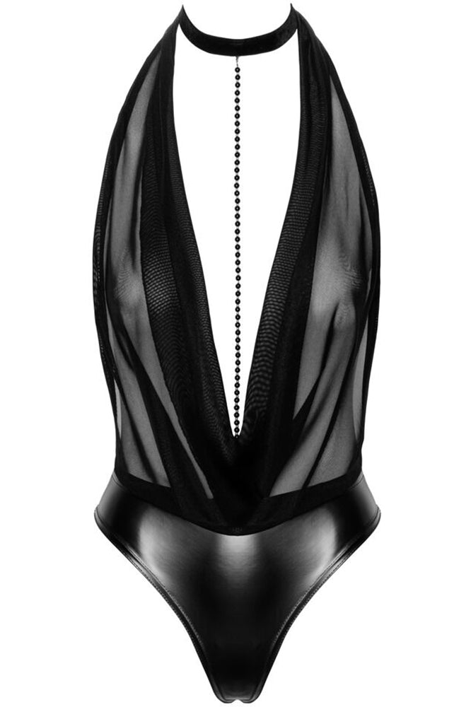 An exclusive style with sex appeal! The elegant black body from Noir has a transparent and shimmering powernet top part, and briefs part that is made out of opaque powerwetlook. There is a very low cowl neck that goes right down to the stretchy waistband. There is a black, vertical pearl chain on the cowl neck that can be removed. It is completely backless. The choker halterneck can be adjusted to fit. It is soft and stretchy for a very comfortable fit.