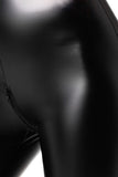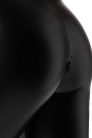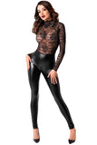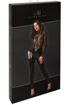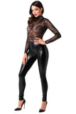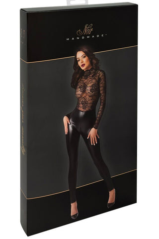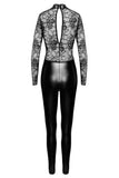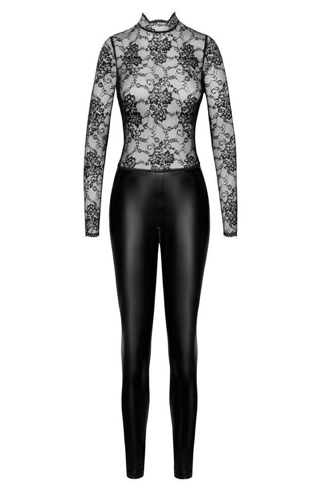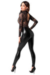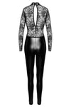 Exclusive style in a beautiful mix of materials! The tight-fitting, black jumpsuit from Noir has long sleeves. The jumpsuit is made out of beautiful lace (top part) and powerwetlook. The jumpsuit fits like a second skin. It is also soft and stretchy for a very comfortable fit. There is a cut-out at the back. It has a stand-up collar with a button fastener. With a zip over the crotch, which is both practical and seductive at the same time.