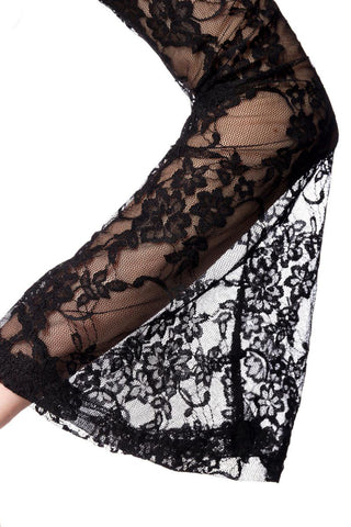 The intricate lace fabric adorned with floral patterns and ornaments creates a captivating and ethereal look. The V-neckline adds a touch of sophistication, while the long sleeves enhance the mysterious aura. The lower part, crafted from soft jersey, ensures comfort and ease of movement.