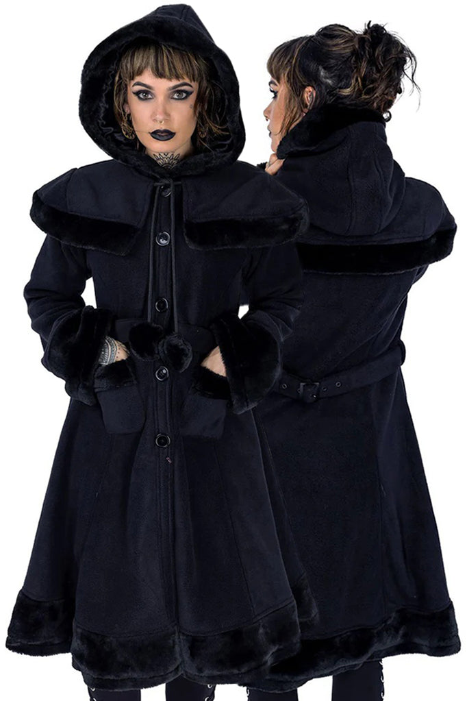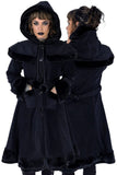 Black fleece 3/4 length coat with faux fur trim to the hood, sleeve cuffs, pocket edges and detatchable shoulder cape. Coat fastens at the front with buttons.