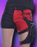 Ladies black and red Cotton Alternative Shorts with clip on side pocket which buckles around the thigh and clips to d-rings at the waistband. The shorts are half red and half black and have black faux leather trim around the edges of the pockets and on the side eyelet panels which have decorative corset style lacing. The shorts have a pocket on each side at the front and two zipped pockets in the attached side pouch. These great goth shorts fasten with a zip and button fly.