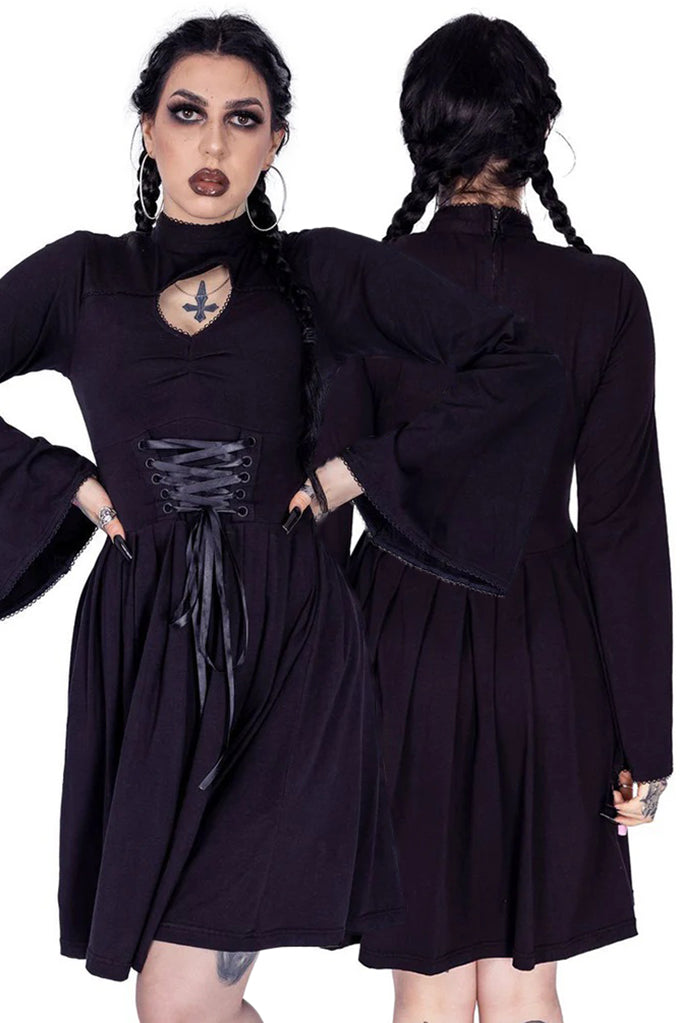 Black flared jersey dress with keyhole cut out on upper chest, flared bell sleeves and corset style ribbon lacing detail at the waist. Edges are trimmed with black scalloped elastic detail. High neck design with half zip at the back to fasten.