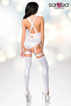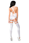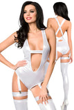The set doesn't stop at the body. It also includes a pair of sultry silver cuffs and adjustable suspender straps with metal clips. These elements add a touch of playful bondage-inspired flair, while ensuring a comfortable and customizable fit. The cuffs feature a bar detail and elastic leg endings, completing the overall look with a touch of edgy sophistication.