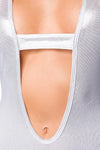 The Saresia Body Set Silver boasts a stunning metallic silver finish with a wet look sheen. This eye-catching design reflects the light beautifully, adding a touch of glamour and intrigue to your look.