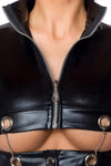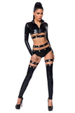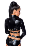 • The combination of black wetlook, chains, and an underboob cut-out creates a powerful and undeniably seductive look.