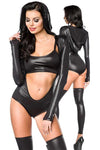 Feel fierce and fabulous in this head-turning body set. The deep neckline and hooded design create a mysterious and alluring silhouette, while the long sleeves with thumb holes add a touch of gothic elegance. The short, spaghetti-strapped top offers a peek of skin, striking the perfect balance between bold and seductive. The body-hugging fit and metallic wetlook finish accentuate your curves, ensuring you'll command attention wherever you go.