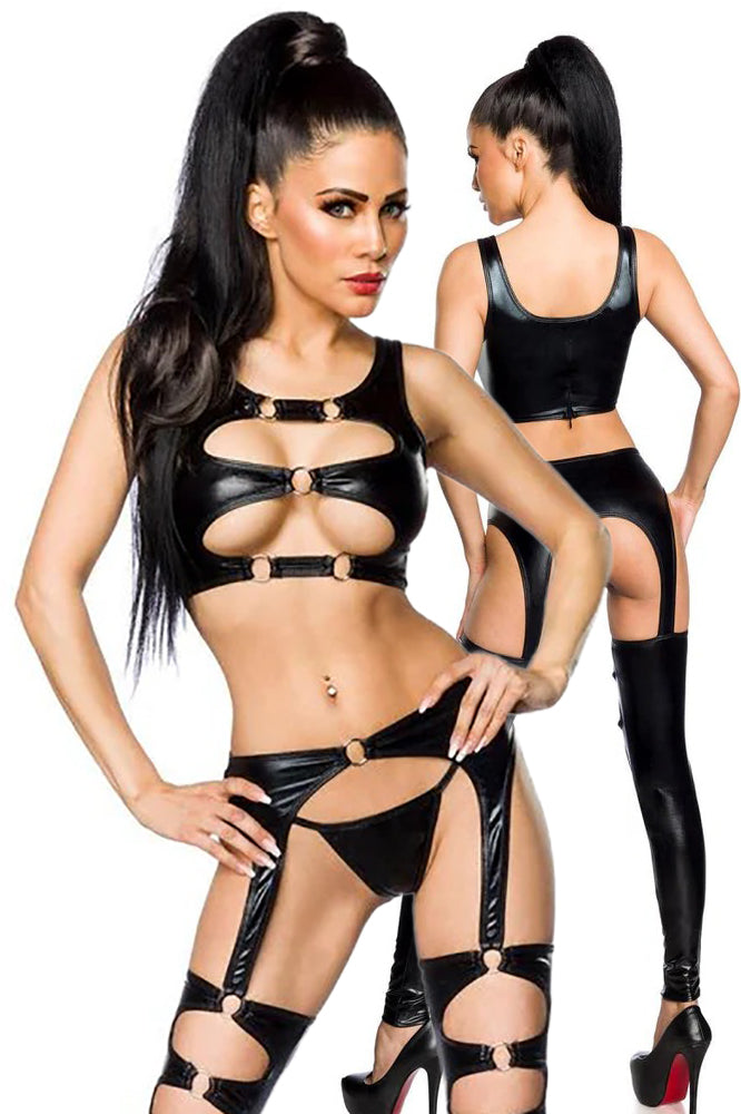 Crafted from luxurious wetlook fabric, the cropped top features striking cutouts and metal rings for a bold statement. The matching chaps leggings, also adorned with cutouts and metal rings, complete the rebellious look. Designed to hug your curves and accentuate your style, this set is guaranteed to turn heads.