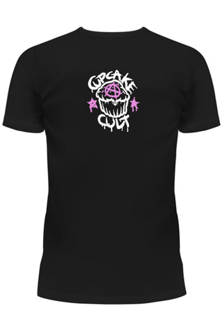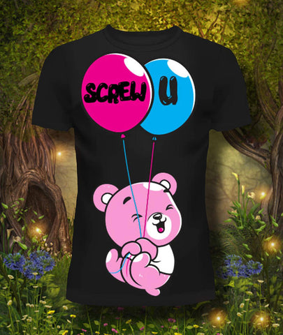 Ladies Black Fitted T-shirt with Screw U Bear and balloons Design.