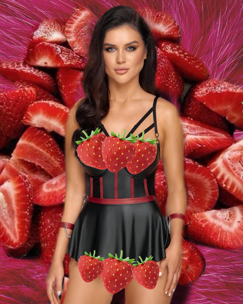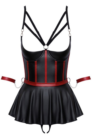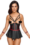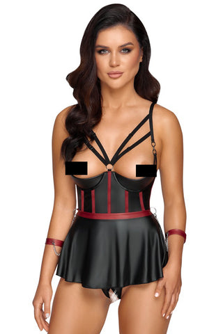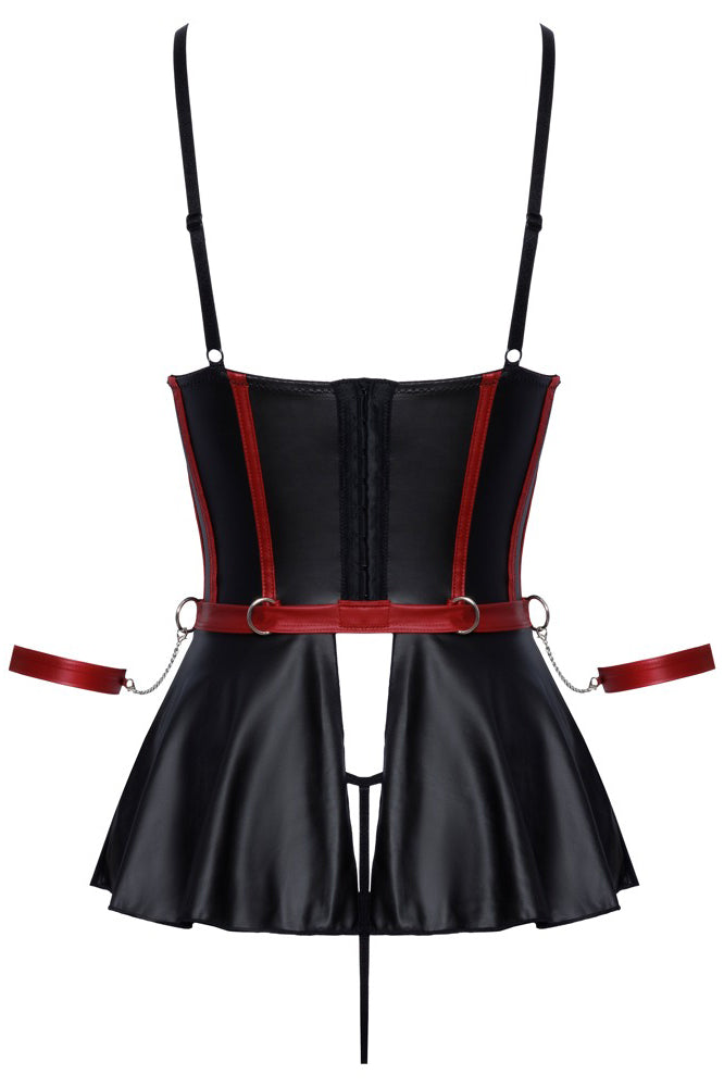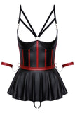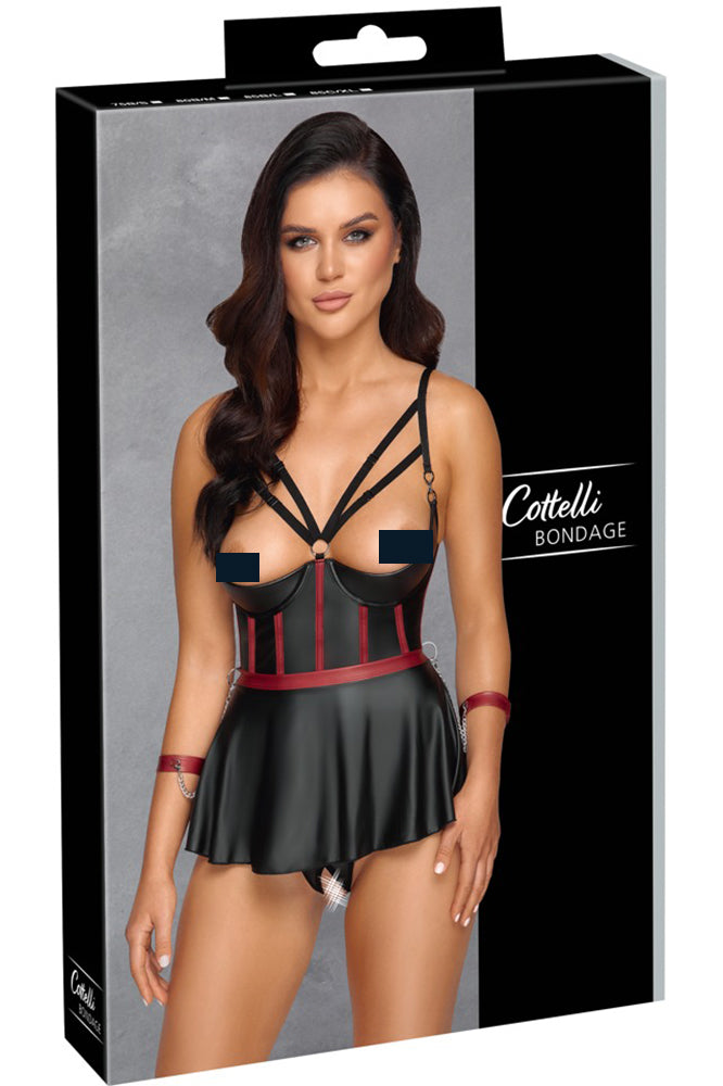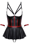 Step into an elegant world of captivating seduction with the Cottelli Bondage Longline Set. This exquisite three-piece ensemble is a perfect fusion of alluring design and comfortable support. It features a sophisticated black matte look with striking red contrasting stripes that create a stunning, waist-accentuating silhouette.
