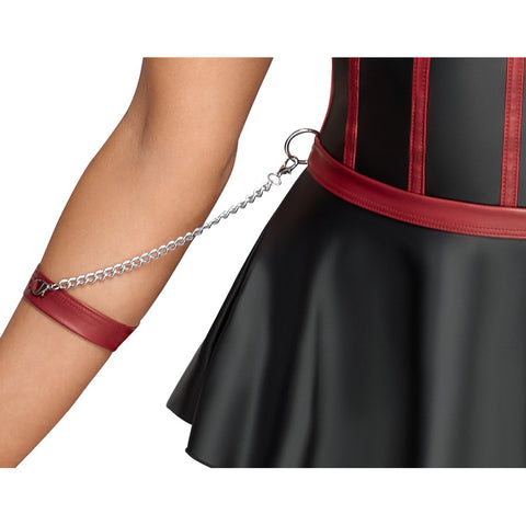 To complete the look, the set includes an invitingly crotchless thong and two soft arm cuffs. The cuffs, with their adjustable hook-and-loop fasteners, attach easily to the four rings on the bra's waistband, creating a complete and captivating bondage-inspired look. Made from a soft, stretchy blend of 90% polyester and 10% spandex, this set offers high comfort without compromising on style.