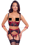 The set’s long, underwired shelf bra is designed to provide a beautiful lift and support, with light padding for a comfortable fit. The slightly wider, adjustable straps and hook fastener at the back ensure a perfect, personalized feel. The suspender belt features a clip fastener at the back and six adjustable suspender straps. To complete this captivating look, a pair of handcuffs/arm restraints with chains are included, which can be easily attached to the rings on either side of the belt. The narrow restraints have adjustable hook-and-loop fasteners for a quick and secure fit. A matching crotchless string is included, adding the perfect finishing touch.