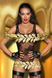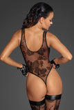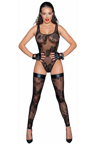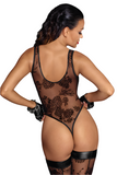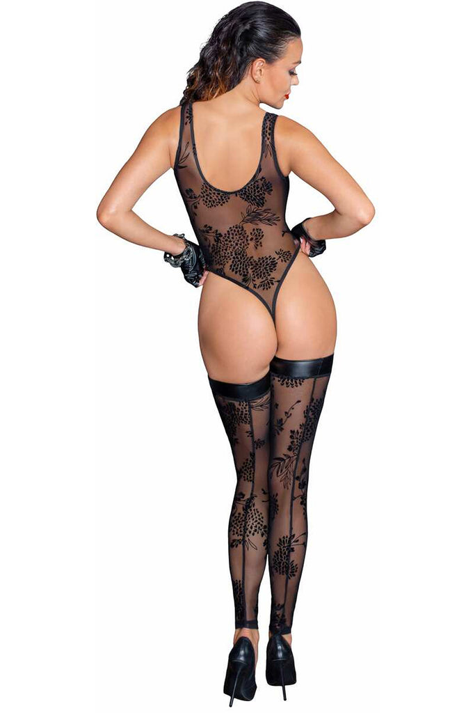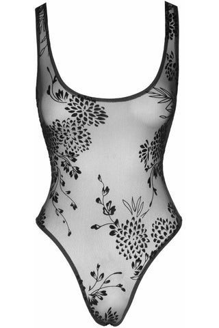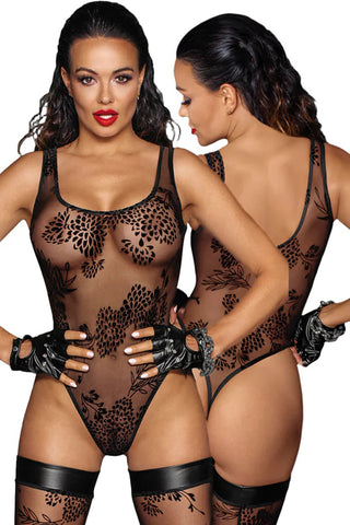 Crafted from the finest elastic mesh, this body is a dream of transparency. The stunning patterned flock embroidery adds a touch of opulence, creating a captivating interplay of light and shadow. Designed to showcase your curves with confidence, this body is the epitome of feminine grace.