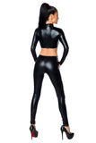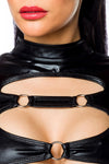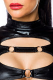 Crafted from luxurious wetlook fabric, the cropped top features a striking collar and long sleeves, adding a touch of sophistication to the edgy cutouts and metal rings. The matching leggings continue the rebellious theme with their own cutouts and metal rings. Designed to hug your curves and accentuate your style, this set is guaranteed to turn heads.