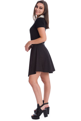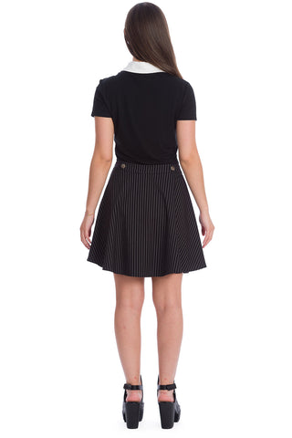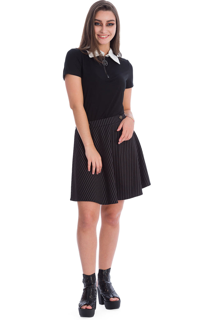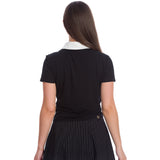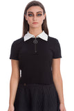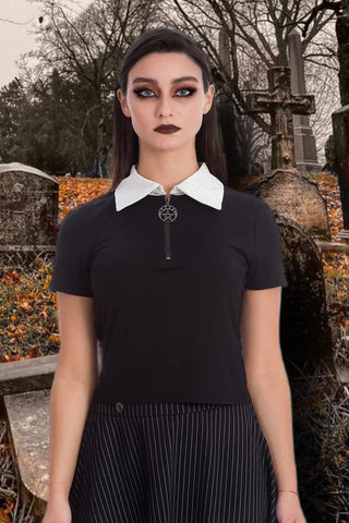 Lovely soft viscose t-shirt style top with shorter length design, featuring a zip at the neck with pentagram and moon symbol zipper pull in gunmetal finish. The top has a cute contrast collar in white satin brocade patterned fabric.