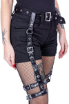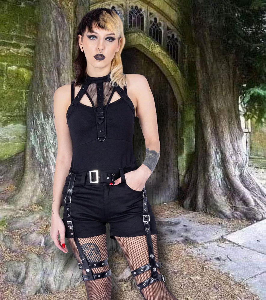 - Black cotton shorts with detachable faux leather leg harness straps: Combine edgy style with a touch of sophistication.