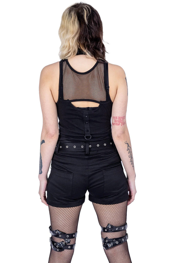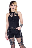 Ladies black cotton shorts with detachable faux lather leg harness straps which attach to the eyeleted black cotton waist belt of the shorts. The short fasten with a zip fly and button and have two pockets at the front and two at the back. The leg straps have press stud adjustments to fasten and fit to correct size.