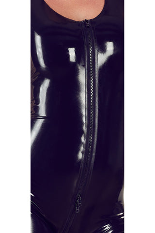 Convenient 3-Way Zip: A practical and arousing 3-way zipper runs from the cleavage, over the crotch, and up to the top of the buttocks. This design makes the catsuit easy to put on and take off while also adding a provocative touch.